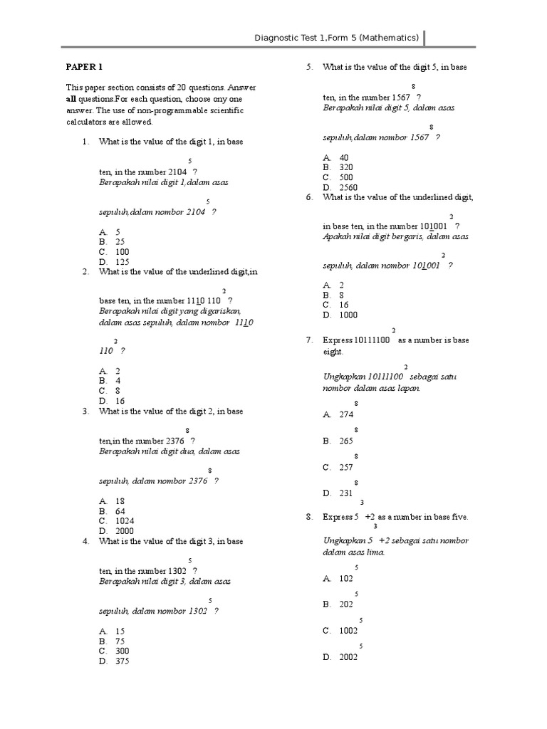 Berapakah nilai digit 5 dalam asas 8. Untuk soalan berbentuk objektif tulis pilihan jawapan pada ruangan yang disediakan 1 Dua puluh dua ribu dua belas ditulis dalam angka ialah Twenty-two thousand and twelve written in numerals is 2 212. 1 sekolah kebangsaan dato syed zain alshahab kluang johor ujian kertas soalan matematik transisi murid tahun 1 arahan soalan.
